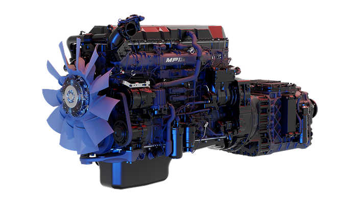 The already extremely efficient and powerful Mack MP13 HE Engine is updated for further fuel efficiency improvements. The engine delivers up to 2-3% fuel efficiency improvement over previous versions due to combustion chamber improvements and a variable speed oil pump. The combustion improvements involve a change to Mack's Wave piston design as well as a change in the connecting rod length and piston height.