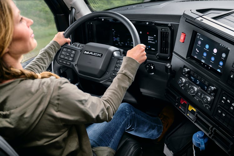 Every control has been positioned with purpose. Flat-bottom steering wheel with multifunction controls and an ergonomic dashboard with 12-inch Mack CoPilot™ display put essential information and controls within easy reach. Gauges on the instrument panel have been positioned higher for better driver visibility, while HVAC controls and the Mack mDRIVE™ automated manual transmission (AMT) shift pad have been relocated closer to the driver's fingertips.